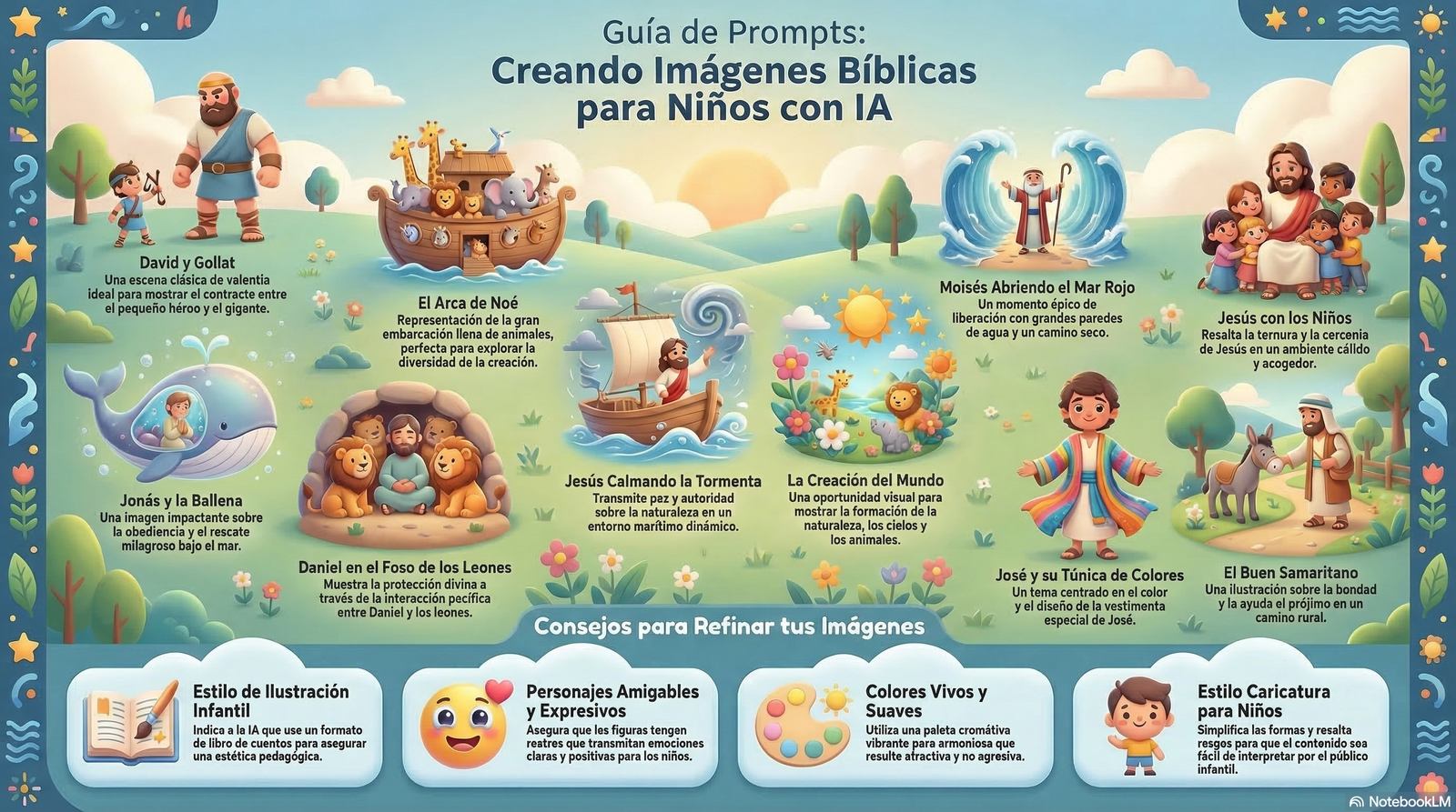 Guía para generar ilustraciones bíblicas infantiles usando inteligencia artificial. Incluye ejemplos de prompts para crear imágenes atractivas y coloridas que acompañen tus lecciones.